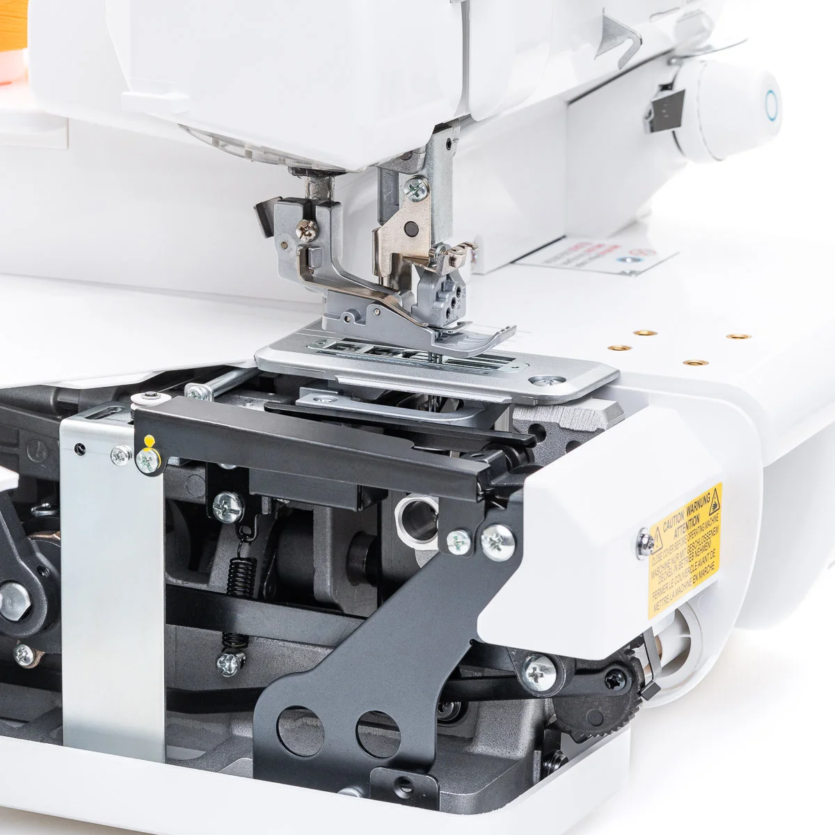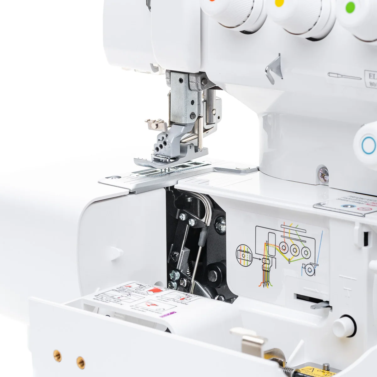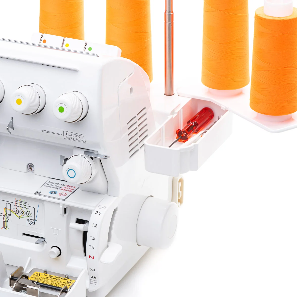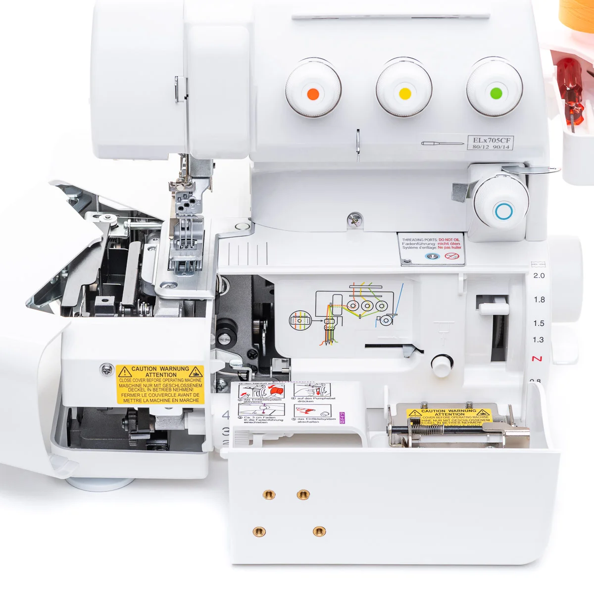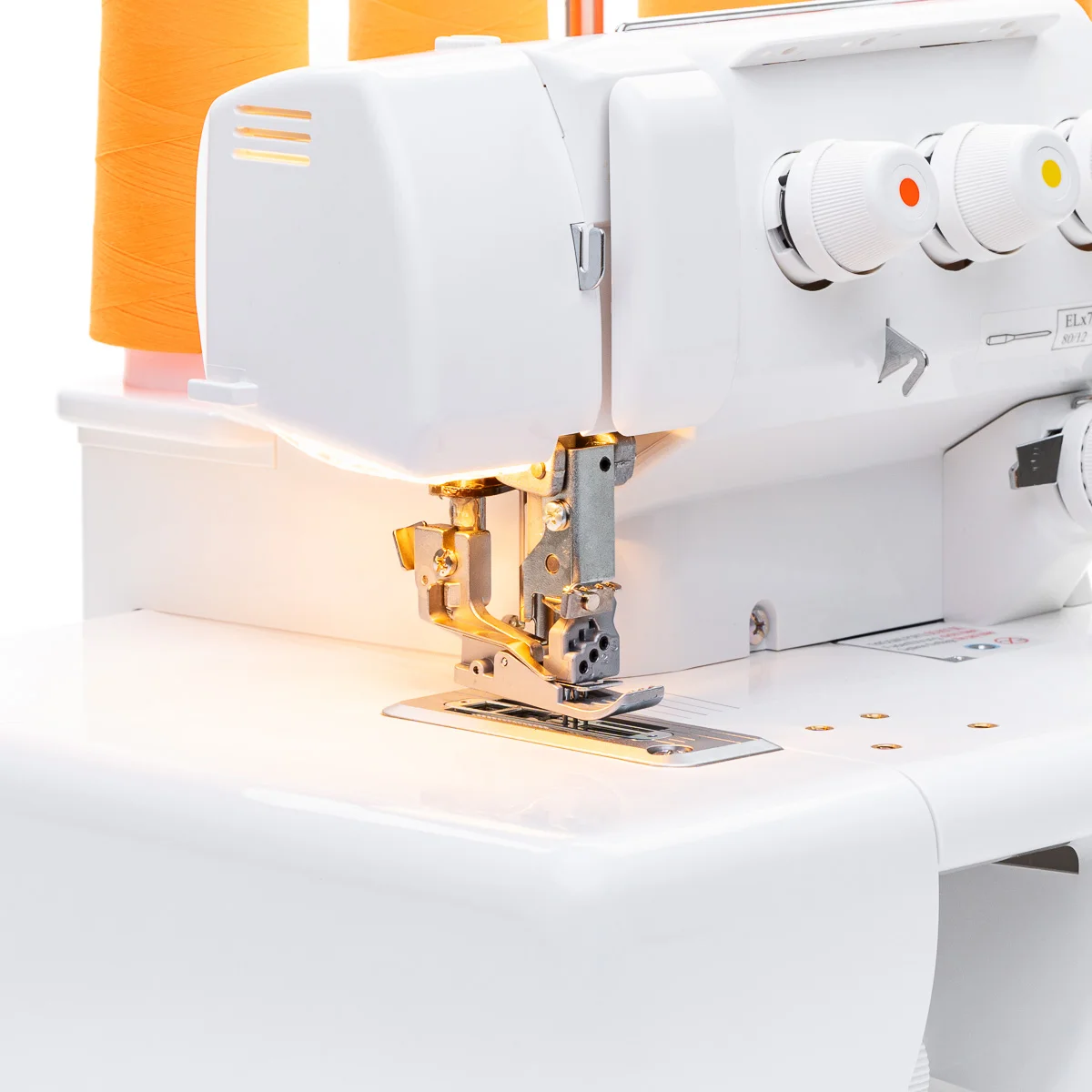 BLCS Babylock Coverstitch 2, 3 und4 Fadenüberdeckstiche mit mehr Platz zwischen Fuß und Stichplatte, Jet-Air-Greifereinfädelsystem, Differentialtransport, Zubehörfach und Normalzubehör.