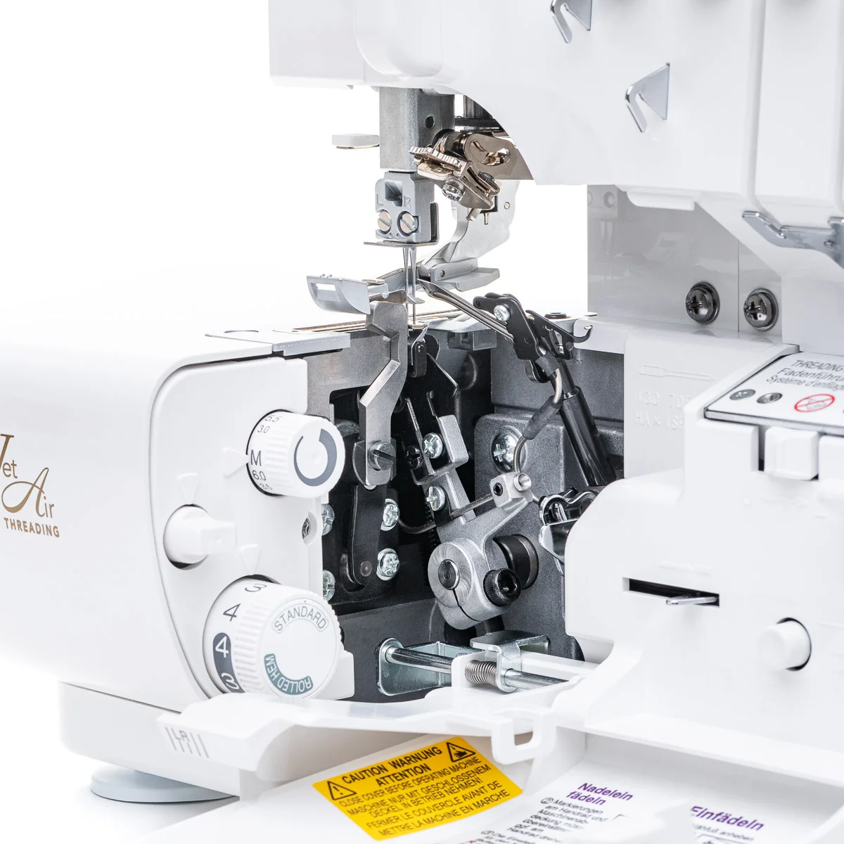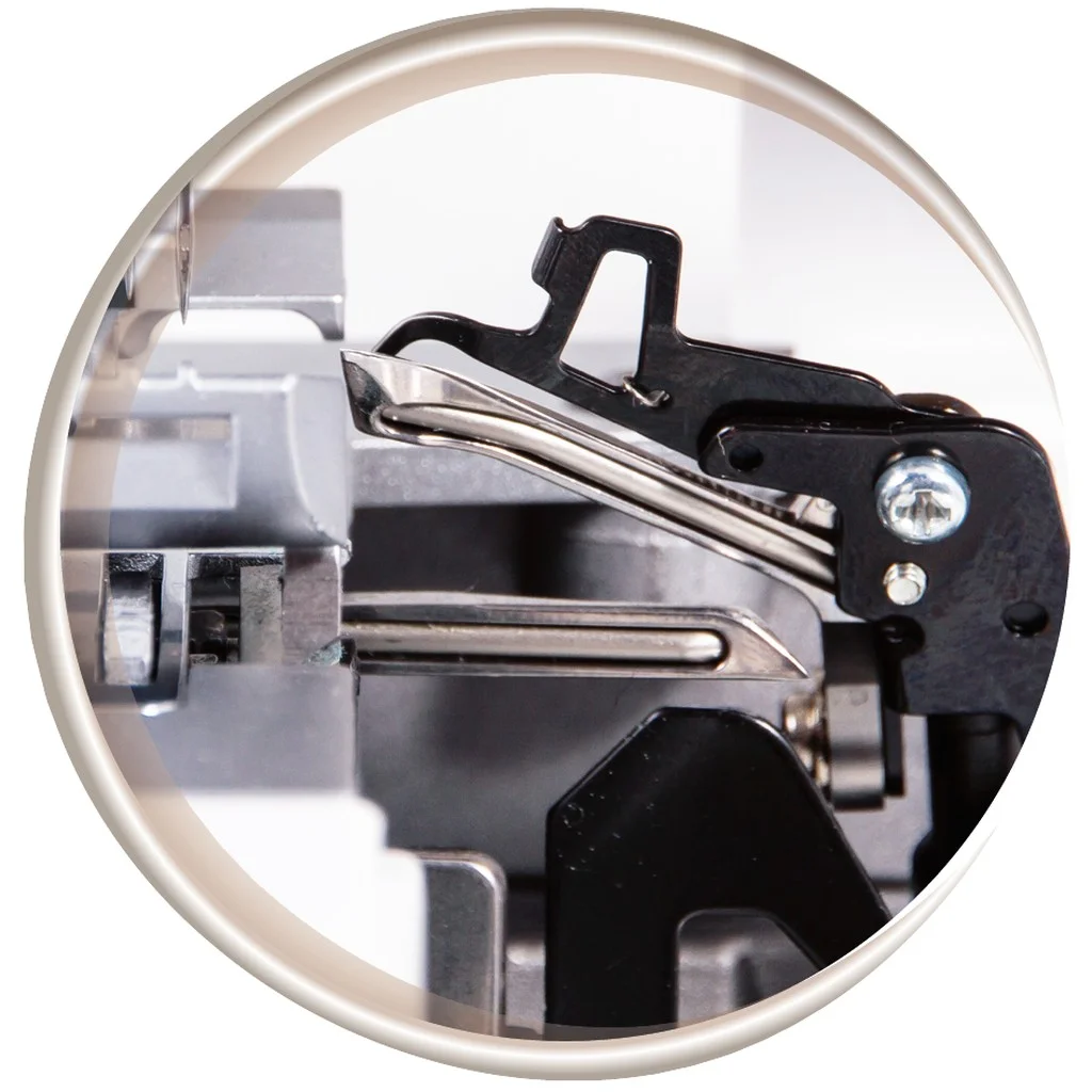 Nähen, schneiden und versäubern. Wellenstich, 2, 3 oder 4  Fäden-Overlockstich, automat. Lufteinfädelung, Nadeleinfädler, 1500 Stiche pro Minute, Licht, Normalzubehör und Abfallbehälter.